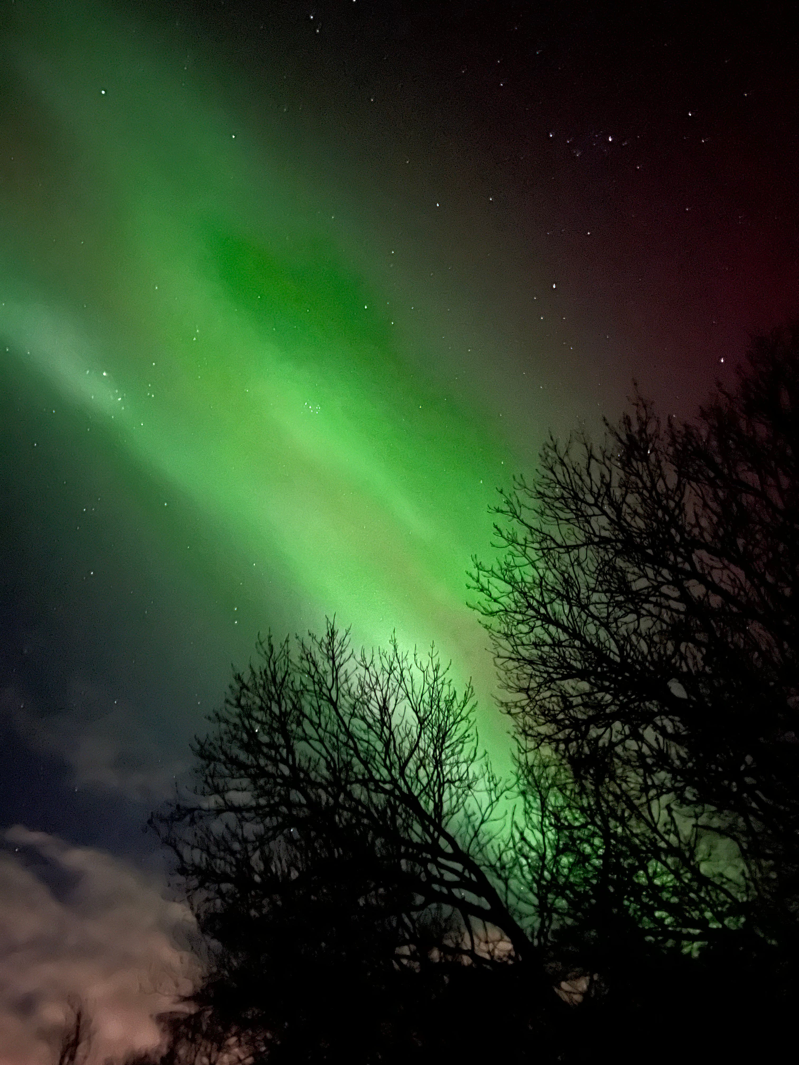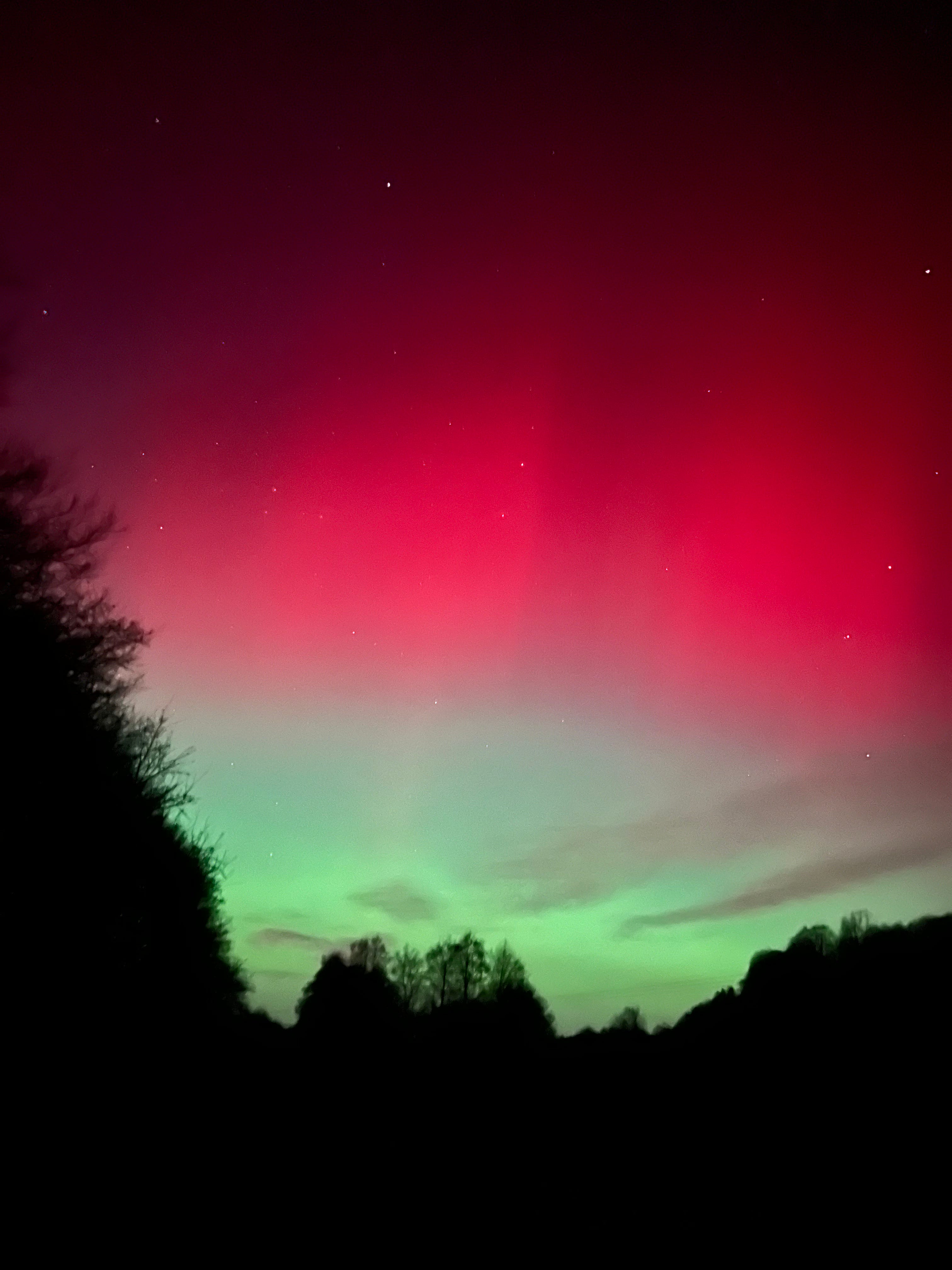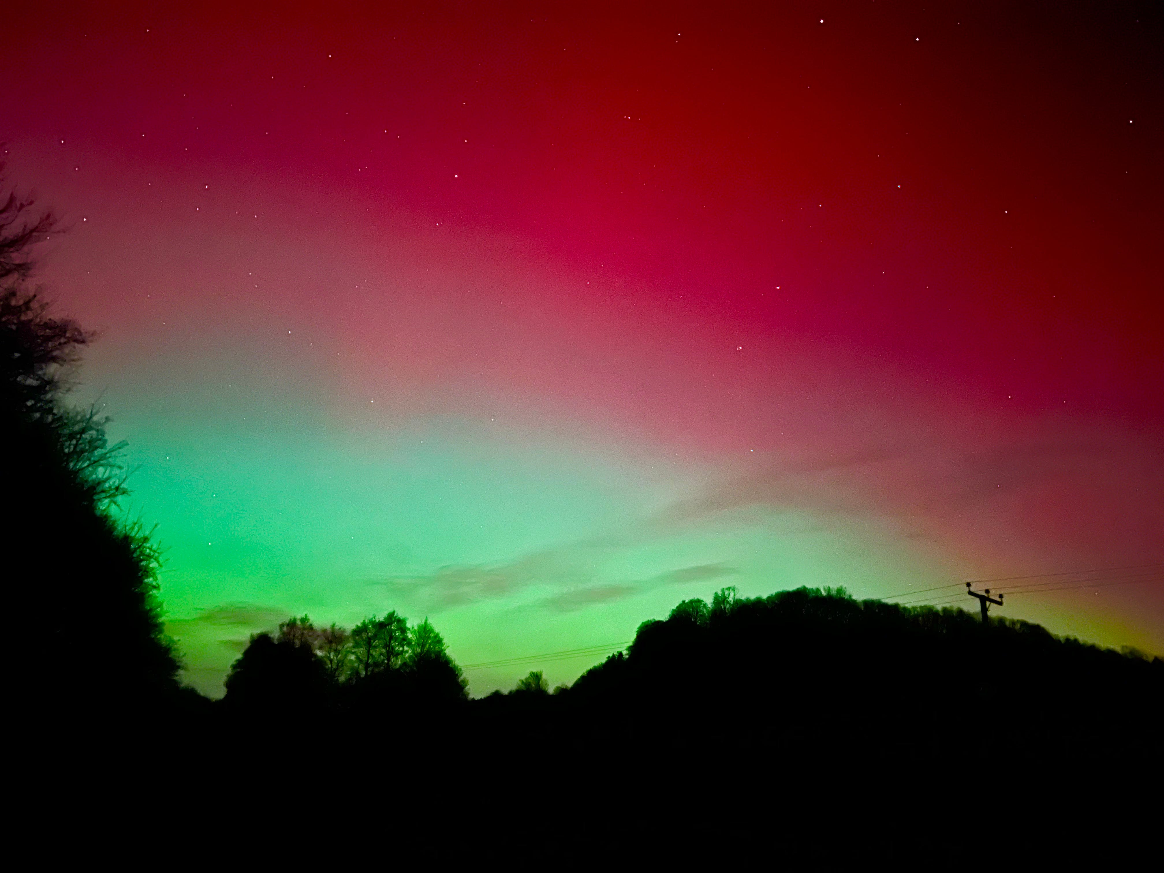 From my Gloucestershire vantage point, the show was not confined to the northern sky. Bands of vivid green (emitted when charged particles strike oxygen atoms) streaked across the sky to the east and southwest, while magenta (from collisions with nitrogen) glowed above green to the north.