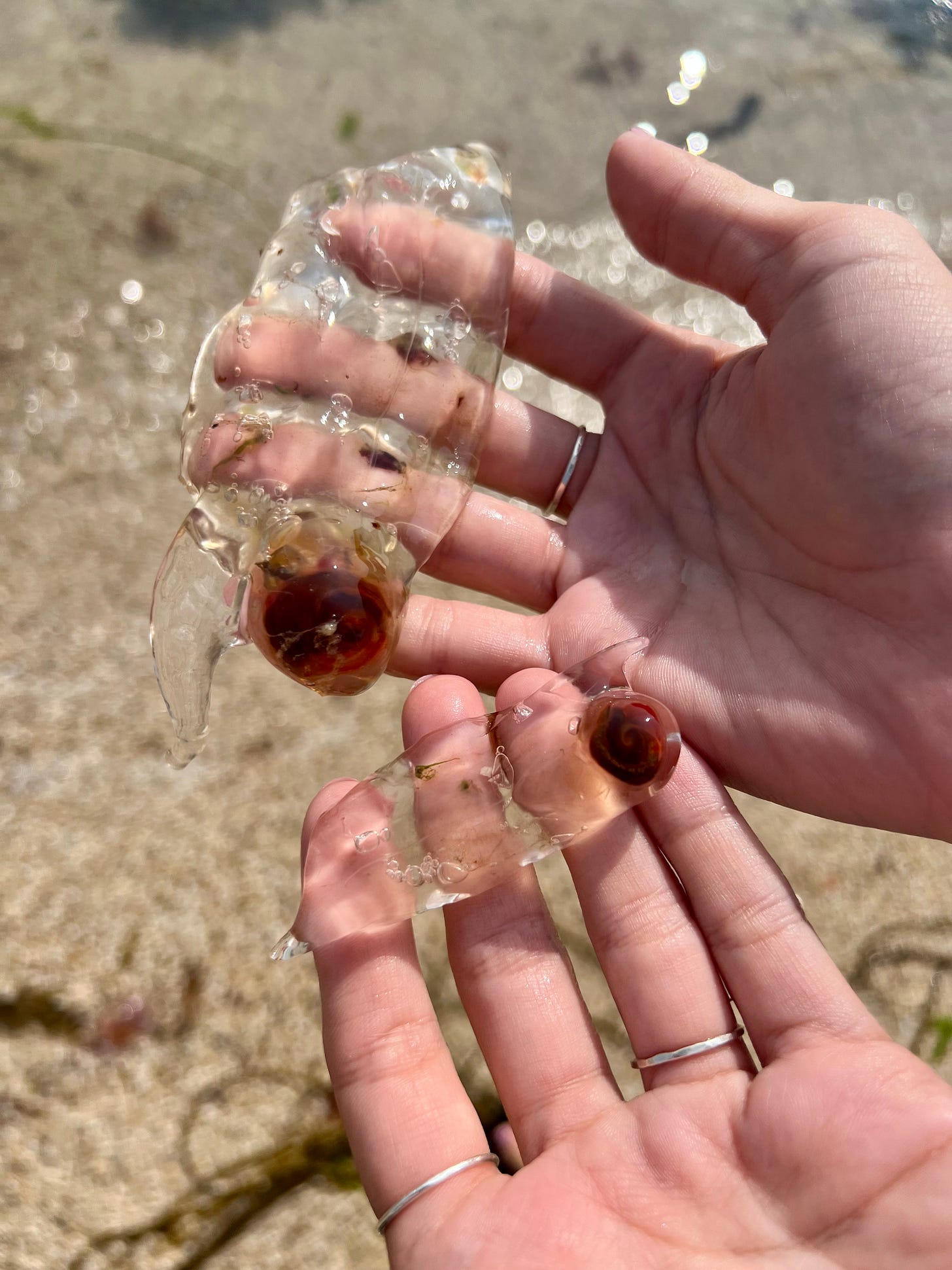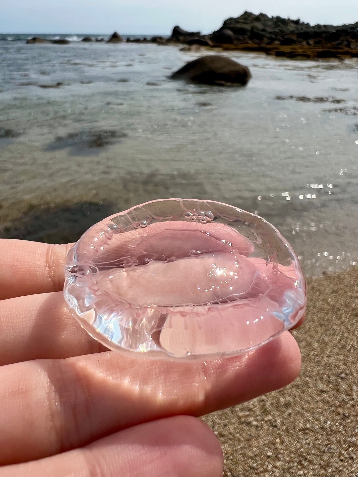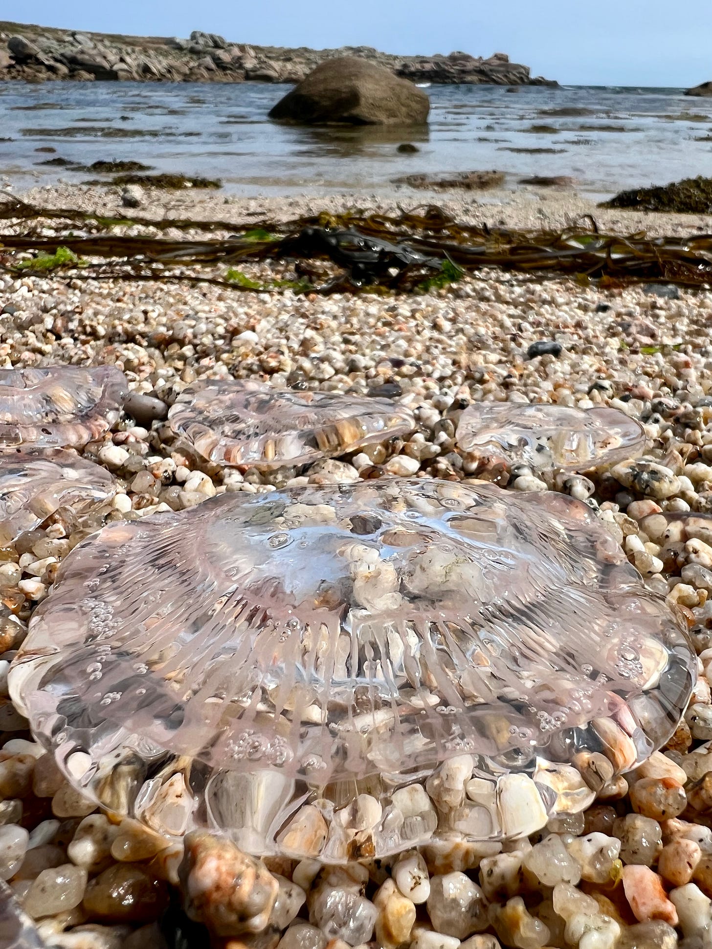 The nearby shallow water was rich with tiny silvery fish (a rescue mission ensued for those trapped in rapidly drying rockpools) and swarming with small jellyfish, mostly mauve stingers, gently pulsing along. Among them, and scattered along the beach, were a few translucent and relatively solid-looking jellies. These crystal jellyfish are known to be bioluminescent (capable of glowing green) and relatively uncommon in British waters, though their presence may be increasing with warming seas. They can sting but apparently don’t cause much harm to humans. Just as well.