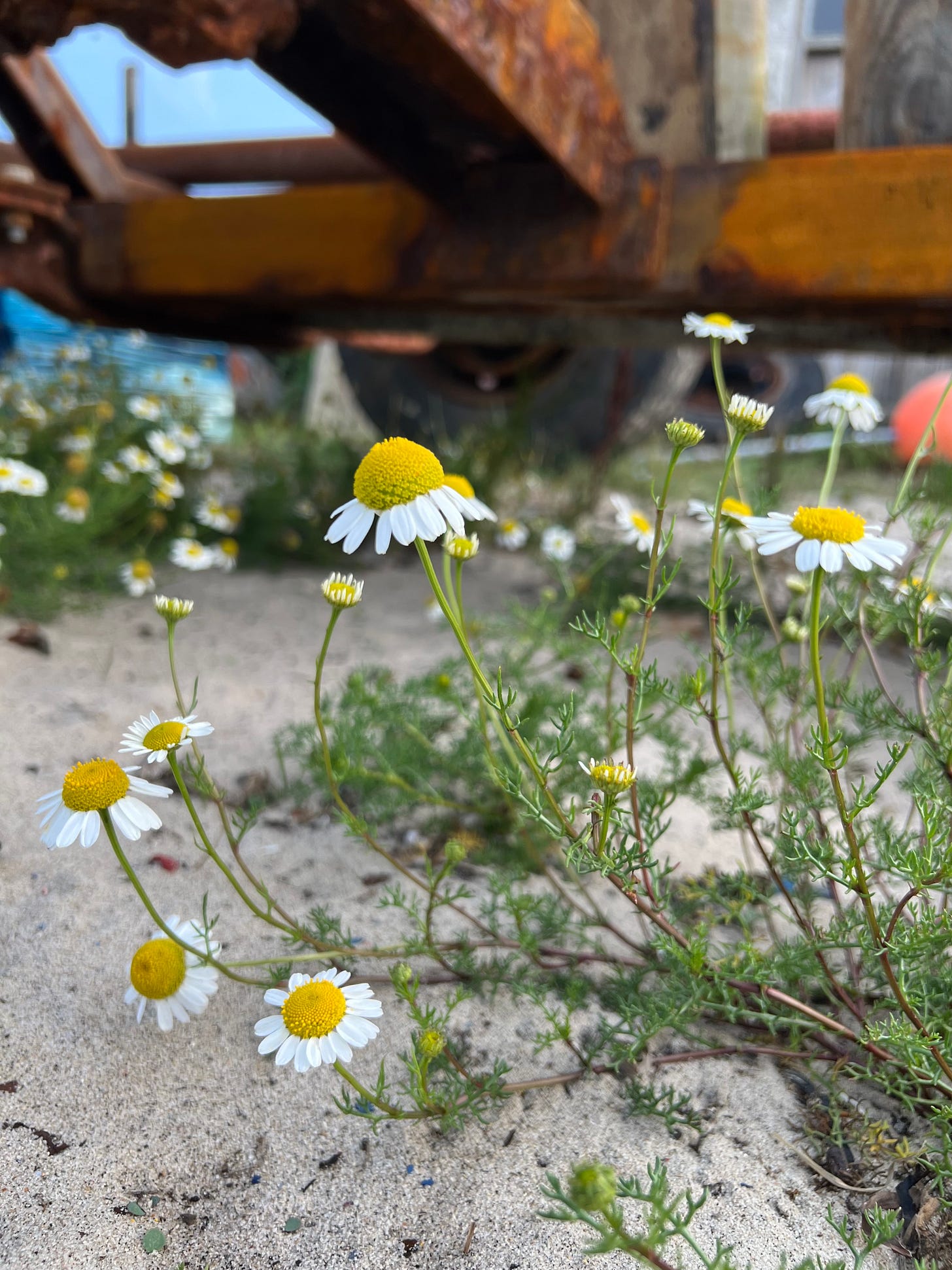 I’m pretty sure this is sea mayweed, growing in the sand in a beach-side boatyard on St Mary’s. The fairly large (4cm diameter) size of its daisy-type flowers means you can get a good look at their composite make up: each one a cluster of tiny, yellow disc-florets, forming a dome shape, encircled by larger, white ray-florets around the edge.