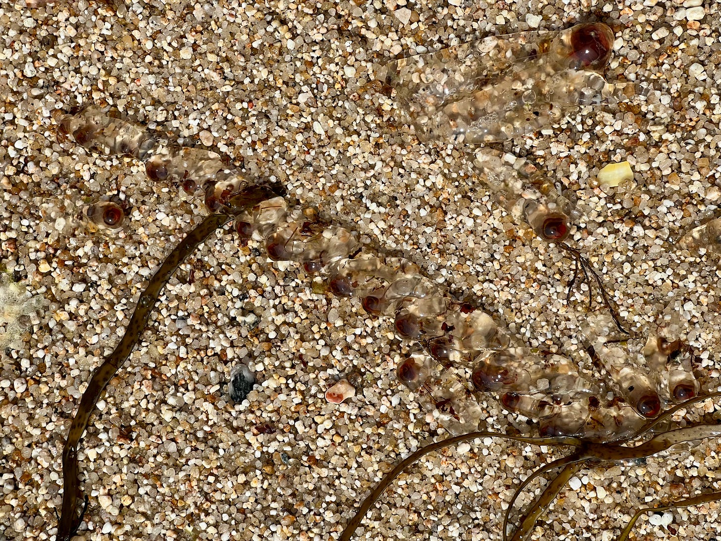 I’d love to see salp chains snaking along under water, jet-propelled, with each individual taking in water through a siphon at the front and using pulses of muscle bands along its body to expel it at the rear. But when a wave washed over this stranded chain, the individual salps instantly released their grip and dispersed.