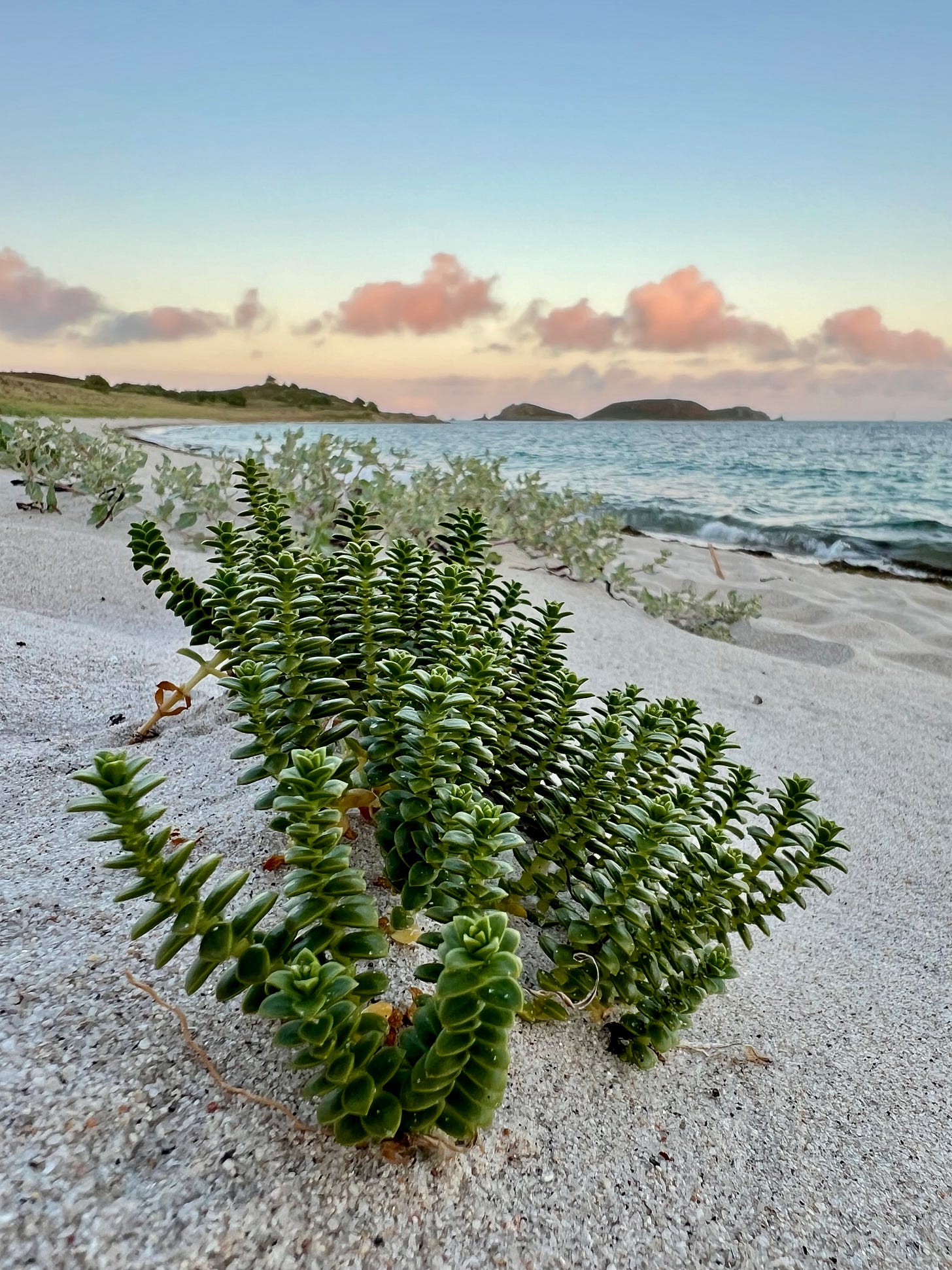 Staying late one evening on St Martins (to indulge in the locally caught and grown fish and chips) saw me strolling along the beach as the sun was going down and spotting this striking architectural plant just in front of the dunes. Its neatly arranged, glossy green leaves make it quite distinctive – sea sandwort – hopefully, I’ll remember its ID next time I come across it.